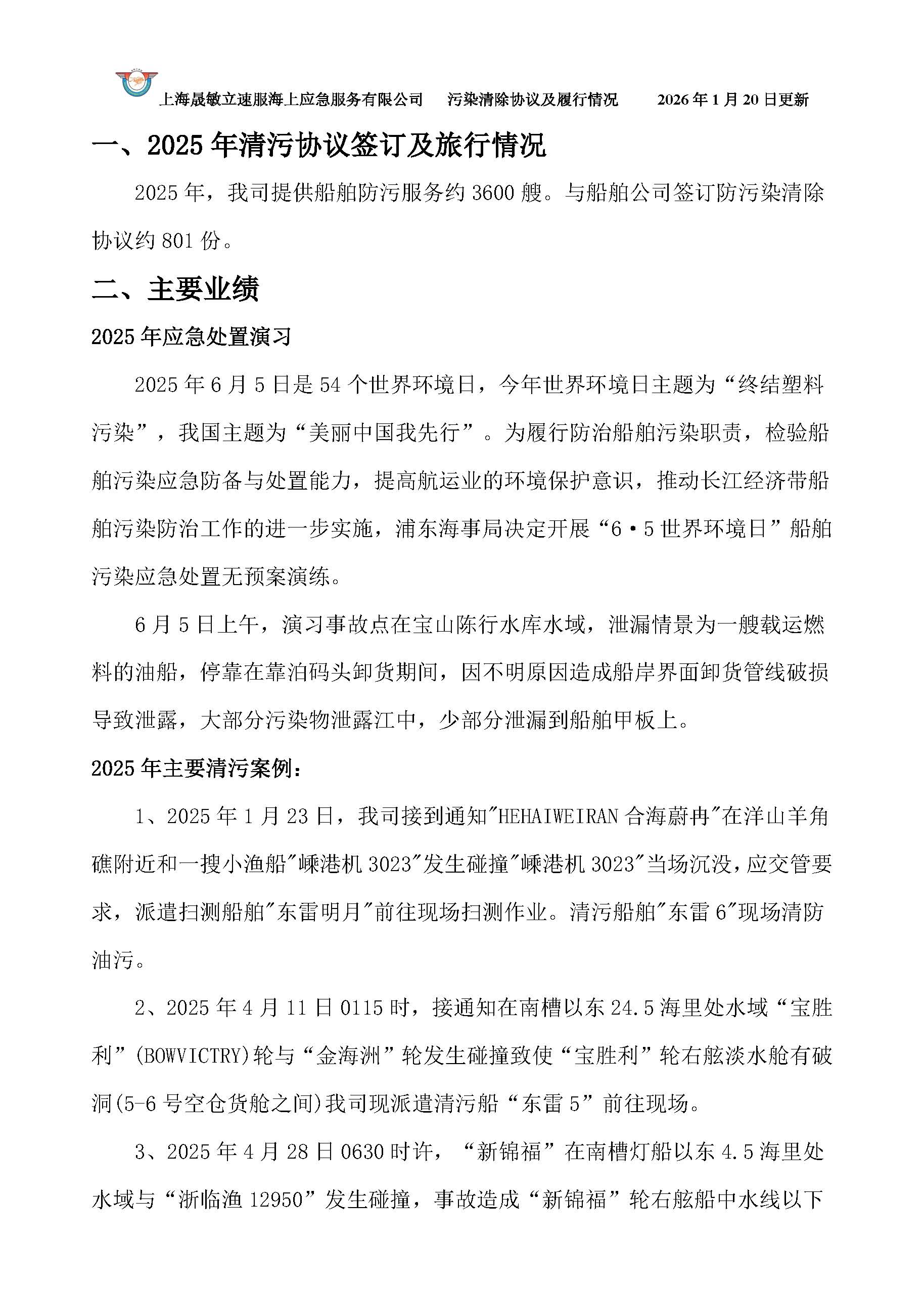 2025年船舶污染清除协议的签订和履行情况以及参与船舶污染事故应急处置工作情况